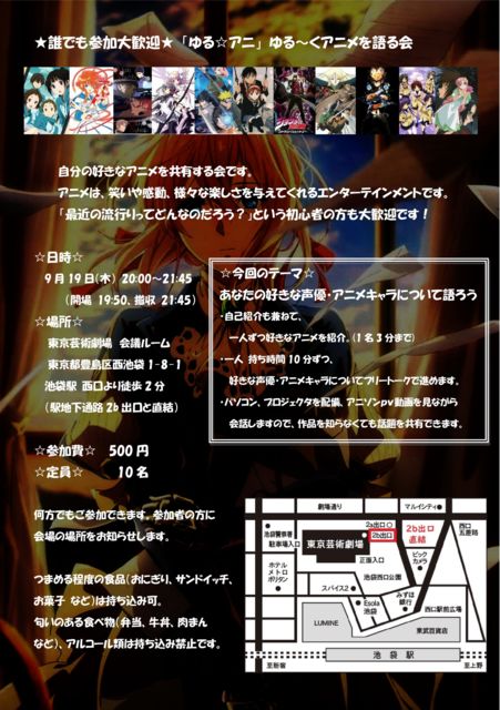 管理者様 スペースをお借りします。 「ゆる☆アニ」は、アニメやマンガをゆる〜く語り合い、自分の好きなことを共有する会です。 1ヵ月に1回のみの開催になりますが、毎回テーマが決まっており、そのテーマについて、フリートークで会話を進めます。 PC・プロジェクタを用意していますので、アニメ・番組を知らなくても話題を共有できます。 アニメは、笑いや感動、様々な楽しさを与えてくれるエンターテインメントです。 知らない作品と出会ったり、新しい楽しみ方も発見出来るかも♪ 「最近の流行りってどんなのだろう?」という初