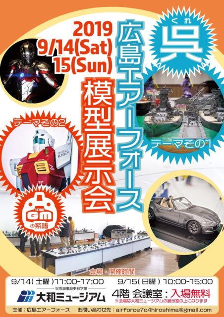2019年9月14日、15日に大和ミュージアムにて広島エアーフォースが模型展示会を開催します! 詳細は下記の通り。 開催日時 9/14(土) 11:00〜17:00 9/15(日) 10:00〜15:00 会場 呉市海事歴史科学館 大和ミュージアム 4階会議室 (〒737-0029 広島県呉市宝町5番20号) http://yamato-museum.com 入場無料ですので是非お越し下さい! (但し駐車場は有料の上、土日はいつも一杯なので公共交通機関がお勧めです) ※模型の完成品の展示のみで販売はありません。