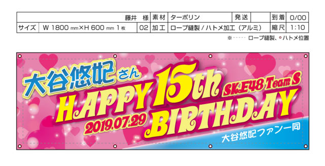 【企画説明】 7月29日は大谷悠妃さんのお誕生日です そこで8月12日(月)京都パルスプラザの握手会にて 横断幕によるお見送りを企画することになりました デザインに関しては、作成するのにあまり時間がありませんので 管理人に一任して頂けると助かります 横断幕を作成するにあたり 5980円(送料・消費税込)の費用が発生します そこで、皆様よりカンパ金のご協力をお願い致します 【贈呈品】 横断幕 【費用】 5980円(送料・消費税込) 【参加費用】 お一人あたり1000円 【募集期間】 9月14日まで 【集金方法】 8/9幕