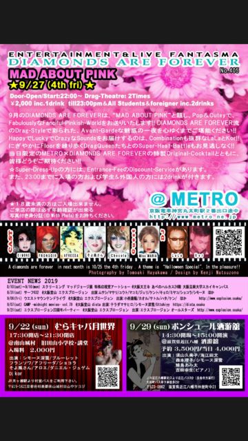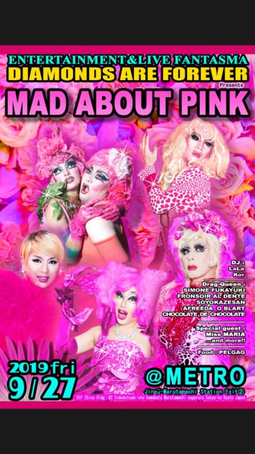 DIAMONDS ARE FOREVER Mad About Pink 2019 09 27 fri PM10:00〜 ¥2000 1drink付 フランソワ・アルデンテ アフリーダ・オー・ブラート そよ風さん ショコラ・ド・ショコラ ミス・マリア シモーヌ深雪 LaLa kor Pelgag @ METRO 京都 神宮丸太町駅 2番出口