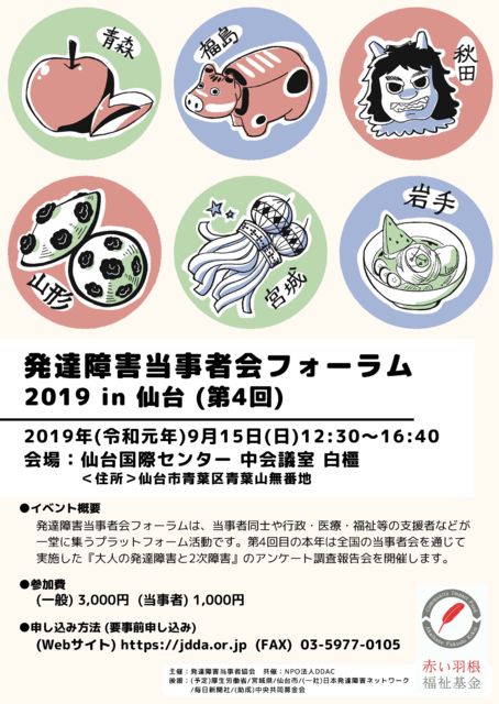 発達障害当事者会フォーラム2019in仙台 <開催概要> 主催:発達障害当事者協会 共催:NPO法人DDAC 後援:厚生労働省・宮城県・仙台市・毎日新聞社・(一社)日本発達障害ネットワーク・中央共同募金会(助成) 『大人の発達障害と2次障害』 アンケート調査報告会 〜調査結果から考える当事者会支援〜 ●パネリスト● *大正大学心理社会学部臨床心理学科 教授 内山登紀夫 氏 *山口学芸大学教育学部 講師 御旅屋達 氏 *厚生労働省発達障害支援室 田中尚樹 氏 *毎日新聞社 生活報道部記者 塩田彩 氏 *NPO法人DDAC 代表