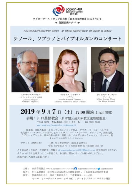 ¥é¥°¥Ó¡¼¥ï¡¼¥ë¥É¥«¥Ã¥×Á°Ìëº×¡ØÆü±Ñʸ²½µ¨´Ö¡Ù¸ø¼°¥¤¥Ù¥ó¥È ¡Ö¥Æ¥Î¡¼¥ë¡¢¥½¥×¥é¥Î¤È¥Ñ¥¤¥×¥ª¥ë¥¬¥ó¤Î¥³¥ó¥µ¡¼¥È¡× ¥¸¥å¥ê¥¢¥ó¡¦¥°¥ì¥´¥ê¡¼¡Ê¥¶¡¦¥¥ó¥°¥¹¥·¥ó¥¬¡¼¥º¡Ë ¥Ó¥¯¥È¥ê¥¢¡¦¥á¥Æ¥ä¡¼¥É¡Ê¥Æ¥Í¥Ö¥ì¡Ë ¥¸¥ç¥Ê¥µ¥ó¡¦¥°¥ì¥´¥ê¡¼¡ÊÂçÀ»Æ²¥ª¥ë¥¬¥Ë¥¹¥È¡Ë 9/7¡ÊÅÚ¡Ë17:00³«±é¡Ê16:30³«¾ì¡Ë Àî¸ý´ðÆÄ¶µ²ñ¡ÊÆüËÜÀ»¸ø²ñÂçºå¶µ¶è¼ç¶µºÂÀ»Æ²¡Ë ¢©550-0021 Âçºå»ÔÀ¾¶èÀî¸ý1-3-8 Tel¡§ 06-6581-5061¡¡ www.nskk.org/osaka/church/kawaguchi ±éÁÕ¶Ê¡§ ±Ñ¹ñ¤Î̾¶Ê¡Ý¥ë¥Í¥Ã¥µ¥ó¥¹¤È¥Ð¥í¥Ã¥¯ºîÉÊ¡¢¥¿¥ê¥¹¡¢¥Ñ¡¼¥»¥ë¡¢¥Ø¥ó¥Ç¥ë ¸½Âå¶Ê¡Ý¥¯¥£¥ë