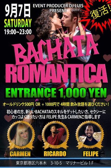 ¥¤¥Ù¥ó¥È̾¡¡¡ÖBACHATA ROMANTICA ¡÷¡¡New Planet¡¡¡× Æü»þ 9·î7ÆüÅÚÍËÆü¡¡19¡§00¡Á¡¡23¡§00 ¾ì½ê¡¡¡ÖNEW¡¡PLANET¡×¡¡¹Á¶èÏ»ËÜÌÚ3-10-5¡¡¥Þ¥ê¡¼¥Ê¥Ó¥ë1F¡¡ºÇ´ó±Ø¡¡Ï»ËÜÌÚ5Èֽиý ¥¨¥ó¥È¥é¥ó¥¹¡¡1000±ß¡¡¡¡ ¡¡¡¡ £Ä¡¡£Ê Ricardo & Felipe¡¡¡ÊLATINOCHANELL¡Ë¡¡ DANCER RICARDO (¥É¥ß¥Î¥«¡Ë FELIPE¡¡¡Ê¥³¥í¥ó¥Ó¥¢¡Ë SPECIAL¥¢¥·¥¹¥ÈDANCER¡¡ CARMEN ¡Ê¥¹¥Ú¥¤¥ó¡Ë¡¡ ¡¡ ¡ú¡ù¡ú¡ù¡ú¡ù¡ú¡ù¡ú¡ù¡ú¡ù¡ú¡ù¡ú¡ù¡ú¡ù¡ú¡ù¡ú¡ù¡ú¡ù¡ú¡ù ÅÁÀâ¤Î¥¤¥Ù¥ó¥È¡ÖBACHATA¡¡ROMANTICA¡×¤¬Éü³è¡ª¡¡ ¡¡ Ëè²óÂçÀ¹¶·¤À¤Ã¤¿DJ¥ë¥¤¥¹¤Î