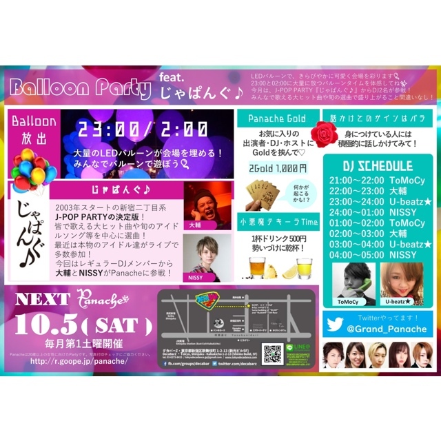 9/7(ÅÚ)¥Ñ¥Ê¥·¥§Balloon Party feat.¤¸¤ã¤Ñ¤ó¤°¢ö@²ÎÉñ´ìÄ®DECABAR Z LED¥Ð¥ë¡¼¥ó¤Ç¡¢¤¤é¤Ó¤ä¤«¤Ë²Ä°¦¤¯²ñ¾ì¤òºÌ¤ê¤Þ¤¹¡ù 23:00¤È02:00¤ËÂçÎ̤ËÊü¤Ä¥Ð¥ë¡¼¥ó¥¿¥¤¥à¤òÂ䶤·¤Æ¤Í¡£ º£·î¤Ï¡¢J-POP PARTY¡Ø¤¸¤ã¤Ñ¤ó¤°¢ö¡Ù¤«¤éDJ2̾¤¬»²À¤ß¤ó¤Ê¤Ç²Î¤¨¤ëÂç¥Ò¥Ã¥È¶Ê¤ä½Ü¤ÎÁª¶Ê¤ÇÀ¹¤ê¾å¤¬¤ë¤³¤È´Ö°ã¤¤¤Ê¤·¡ª¡ª ¢¡BalloonÊü½Ð¡ª ÂçÎ̤ÎLED¥Ð¥ë¡¼¥ó¤¬²ñ¾ì¤òËä¤á¤ë¡ª¤ß¤ó¤Ê¤Ç¥Ð¥ë¡¼¥ó¤ÇÍ·¤Ü¤¦¢ö ¡úÏ䷳ݤ±¤Æ¤Í¤Î¥µ¥¤¥ó¤Ï¥Ð¥é¡¡ ¥Ê¥ó¥ÑÂÔ¤Á¤âOK ¡ú¥Æ¥¡¼¥éTime¡¡Àª¤¤¤Å¤±¤ËShot¤Ç´¥ÇÕ¡ª ¡úTIP¤ò¤ªµ¤¤ËÆþ¤ê¤Î½Ð±é¼Ô¤Ë¶´¤ó¤Ç¤Í ¡ÚDJ¡Û¤¸¤ã¤Ñ¤ó¤°