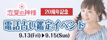 「恋愛の神様」という今年20周年を迎える老舗恋愛占いサイトが、 3日間限定で電話占いを行います。 詳細は↓。(※PCからアクセスするとガラケー用ページに飛びます) http://renkami.indexweb.co.jp/page/tell20kikaku/ 是非ご参加ください(^^)