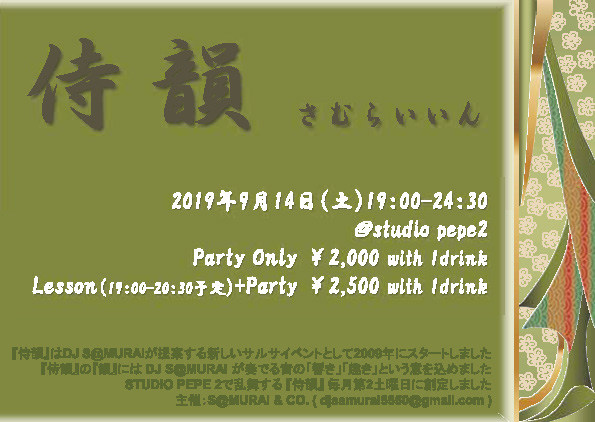studio pepe2¤ÇÍðÉñ¤¹¤ë¡¡DJ S@MURAI¥ª¡¼¥¬¥Ê¥¤¥º¥¤¥Ù¥ó¥È¡Ø»ø±¤¡Ù¡¢ 9·î¤Ï14Æü(ÅÚ) ³«ºÅ¤Ç¤¹¡£ ¹¥É¾Äº¤¤¤Æ¤¤¤ë¡ÖCha Cha Cha¡×¤Î¥ì¥Ã¥¹¥ó¤Ë¤ÏDJ S@MURAI¤â»²²Ã¤·¡¢¶Ê¤Î¾Ò²ð¤ä²òÀâ¤Ê¤É¡¢²»³ÚŪ¦Ì̤«¤é¡ÖCha Cha Cha¡×¤Ë¶½Ì£¤ò»ý¤Ã¤Æ¤â¤é¤¨¤ë¤è¤¦¤Ë¤È¹Í¤¨¤Æ¤¤¤Þ¤¹¡£ º£·î¤Î¥ì¥Ã¥¹¥ó¤Ï¡¢JonathanÀèÀ¸¤Ç¤¹¡£ ¡Ø»ø±¤¡Ù¤ÏDJ S@MURAI¤¬Ä󰯤¹¤ëº£¤Þ¤Ç¤Ë¤Ê¤¤¥µ¥ë¥µ¥¤¥Ù¥ó¥È¤È¤·¤Æ2009ǯ¤Ë¥¹¥¿¡¼¥È¤·¤Þ¤·¤¿¡£ ¡Ø»ø±¤¡Ù¤Î¡Ø±¤¡Ù¤Ë¤ÏS@MURAI¤¬ÁդǤ벻¤Î¡Ö¶Á¤¡×¡Ö¿§¡×¡Ö¤ª¤â¤à¤¡×¤È¤¤¤¦°Õ¤ò¹þ¤á¤Þ¤·¤¿¡£ ¤µ¤é¤Ë ¡Ø±¤¡Ù¡á¡Öinn¡×¤ä¡Öin¡×¤ÈÃÖ¤´¹¤¨