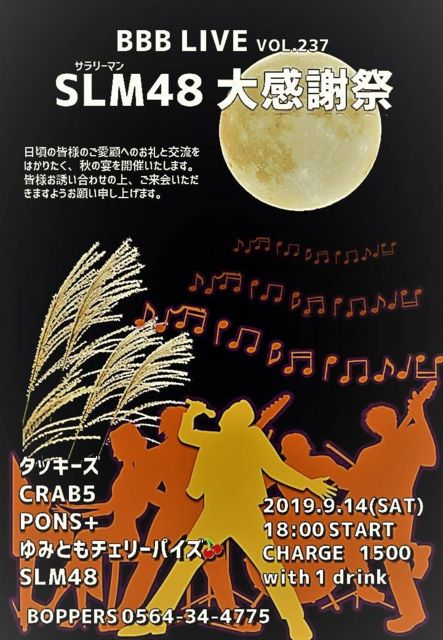 BBB LIVE 237 SLM48 Âç´¶¼Õº× 2019.9.14 (SAT) 18:00 START CHARGE \1500 with 1drink ¥¿¥Ã¥¡¼¥º CRAB5 PONS+ ¤æ¤ß¤È¤â¥Á¥§¥ê¡¼¥Ñ¥¤¥º SLM48