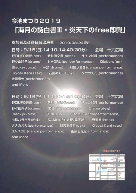 ¤«¤Ä¤Æ2005ǯ¡¢2006ǯ¡¢2008ǯ¤È3²ó¡¢"»íŪɽ¸½½¸ÃÄ"¸ÀÍÕ¥º¡¼¥«¤òΨ¤¤¤Æ¥Î¡¼¥¹¥¢¥¤¥é¥ó¥É²ñ¾ì¤Ë½Ð±é¤·¤¿¡¢¤¤¤¤¤¤º£ÃÓ¤ª¤Þ¤Ä¤ê¥¦¥£¡¼¥¯(º£ÃӤޤĤê)¤Ë11ǯ¿¶¤ê¤Ë½Ð±é¡£ º£²ó¤Ï3²óÌܤȤʤ뺣ÃÓ¡Ö³¤·î¤Î»í¡×ÏȤΡس¤·î¤Î»íÇò½ñ¡Ù¤Î2ÆüÌܤ˽бé¤È¤Ê¤ê¤Þ¤¹¡£ ¢£9/15(Æü)&9/16(·î½Ë) ¡Ø³¤·î¤Î»íÇò½ñ·¡¦±êÅ·²¼¤Îfree¨¶½¡Ù ¢¢9/15(Æü) ²ñ¾ì:½½Ï»¹¾ì 14:10-14:40(30ʬ) ½Ð±é: Ìî¸ýUFOµÁÆÁ(dejambe) ¥µ¥¤¥ó²ÃÆ£(performance) ¿·°æÅÄʸ¸ç(bass) Diaboro(eg) Blacky(Voice) °ìÃÌ(drums) ·îɱ¤¦¤µ¤®(dance performance) Kiyoshi Kani(sax) ÀÐÅĤá