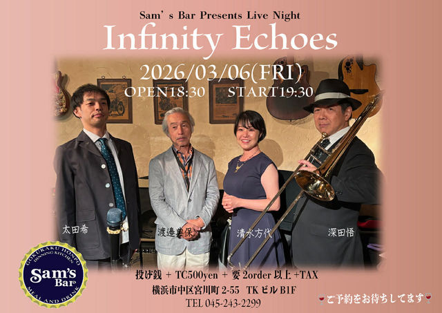 Æü»þ¡§3·î6Æü¡Ê¶â¡Ëopen 18:30 / start 19:30- ¾ì½ê¡§ÌîÌÓsam's bar https://www7b.biglobe.ne.jp/~samsbar/ MC¡§ÅꤲÁ¬¡Ê¡ÜTC¡§500±ß¡Ë¡ù2Éʰʾå¤Î¤´Ãíʸ¤ò¤ª´ê¤¤¤·¤Þ¤¹¡ù ¥á¥ó¥Ð¡¼¡§a.sax/ÅÏÊÕŵÊÝ¡¡tb/¿¼Åĸ硡gt/ÂÀÅÄ´õ¡¡vo/À¶¿åÊýÂå ÌÀ¸åÆü3/6¡Ê¶â¡Ë¤Ïµ×¤·¿¶¤ê¤ËÌîÌÓsam's bar¤Ç¥é¥¤¥Ö¢ö 19»þȾ¤«¤é±éÁÕ¤·¤Þ¤¹¡ª º£²ó¤â¥È¥í¥ó¥Ü¡¼¥ó¿¼Åĸ礵¤ó¡¢7¸¹¥®¥¿¡¼ÂÀÅÄ´õ¤µ¤ó¡¢»ä¤ÎInfinity Echoes¤ËÁÇÀ²¤é¤·¤¤¥¢¥ë¥È¥µ¥Ã¥¯¥¹ÁÕ¼ÔÅÏÊÕŵÊݤµ¤ó¤ò¤ª·Þ¤¨¤·¤Æ¤Î¥«¥ë¥Æ¥Ã¥È·Á¼°¤Ç¡ù Âç¸æ½ê´É³Ú´ïÁÕ¼Ô¤ª¤Õ¤¿¤ê¤ÎÈþ¤·¤¤¥¢¥ó¥µ¥ó¥Ö¥ë¤ä½Â¤¤¥½¥í¡¢»Ù¤¨¤ë