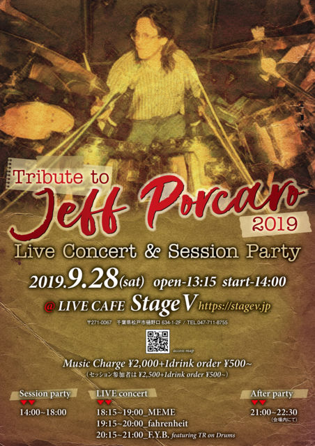 fahrenheitページにイベント立て忘れてました。。 来たる9月28日、千葉県松戸市にあるLIVE CAFE Stage Vさんでライブ&セッションの主催をします。 今年もファーレンハイトとして出演します! Stage Vさんは専属シェフもいて美味しい料理も沢山あります^^ 長時間のイベントですが飽きることなく楽しめますので、是非とも遊びに来てくださいね^^♪ ★Tribute to Jeff Porcaro 2019 Live Concert & Session Party★ ■開催日 2019年9月28日(土) ■会場 LIVE CAFE Stage V http://www.stagev.jp/access.html 〒271-0067 千葉