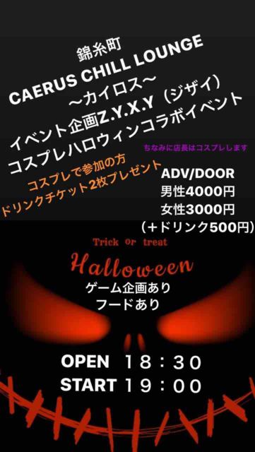 初めまして! 告知させてください! 令和元年10月26日(土) 錦糸町 CAERUS CHILL LOUNGE 〜カイロス〜 イベント企画Z.Y.X.Y(ジザイ) コスプレハロウィンコラボイベント OPEN 18:30 START 19:00 close 23:00 ADV/DOOR 男性4500円 女性3500円 (ワンドリンク付き) ドリンク500円 ゲーム企画あり フードあり DJあり コスプレ有りの方ドリチケ2枚サービス! 宗教やネットビジネス等の勧誘は禁止としてます! 興味ある方はメッセージください! インスタもあげとくのでそちらもチェックしてください!!