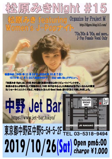 【松原みきNight! #15】松原みき featuring Women's J-Popナイト2019 日時:2019年10月26日 Open pm6:00- 場所:中野 Jet Bar 住所:東京都中野区中野5-54-5-2F 最寄駅:JR・東京メトロ東西線/中野駅北口から徒歩5分 電話番号:03-5318-9494 https://www.jet-bar.tokyo/ ※スタートは準備出来しだい 年1回の松原みきさんのトリビュート・イベントとして続けてまいましたが、今回で15回目となります。 松原みきさんの曲を中心に邦楽の女性ヴォーカルもの限定のDJイベントです。みきさんの活動された80年代を中心に据えてますが、年代・