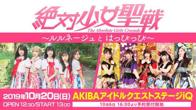 「絶対少女聖戦〜ルルネージュとはっぴっぴ〜」 日時:10/20(日) 開場12:30 / 開演13:00 会場:AKIBAアイドルクエストステージ iQ 料金:前売2,000円 / 当日2,500円 (D別) 出演:ルルネージュ / はっぴっぴ TIGET:https://tiget.net/events/69138