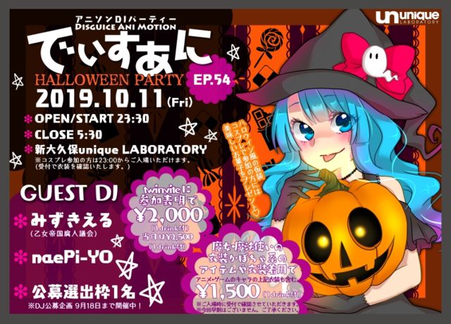 AnimeSong DJ Party Disguise(仮装⇔コスプレ)+ Anime(アニメ)+Motion(動き)=「AniMotion」 略して… でぃすあに でぃすあに は、「楽しく自由に」をコンセプトに 懐かしのアニソンから最新のアニソン、 誰もが聴いたことのある定番曲から少しマニアックな曲 また、ゲームソングや特撮ソング、J-POPも聴けるかもしれない 2009年から続くアニメソング原曲中心のDJパーティーです。 思いきり踊るのもOK! お酒を飲んでみんなでワイワイ騒ぐのもOK! 座ってまったり楽しむのもOK! どう楽しむかはアナタ次第♪ 「アニク