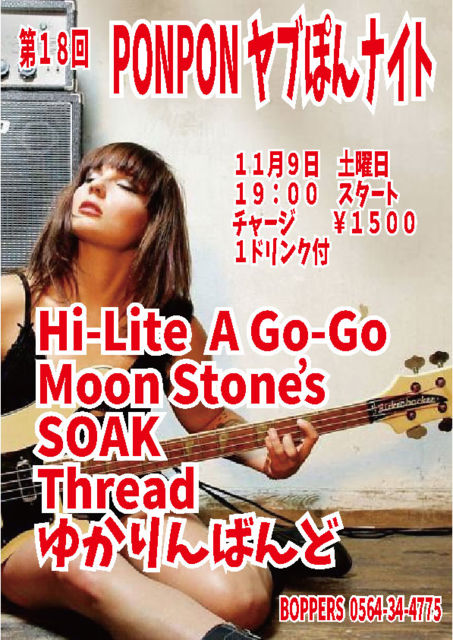 第18回 PONPONヤブぽんナイト 11月9日 土曜日 19:00 スタート チャージ ¥1500 1ドリンク付 Hi-Lite A Go-Go Moon Stone's SOAK Thread ゆかりんばんど