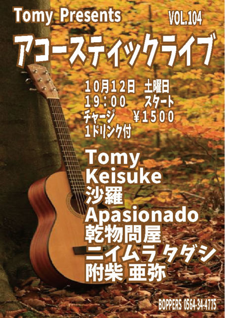 Tomy Presents アコースティックライブ 104 10月12日 土曜日 19:00 スタート チャージ ¥1500 1ドリンク付 Tomy Keisuke 沙羅 Apasionado 乾物問屋 ニイムラ タダシ 附柴 亜弥