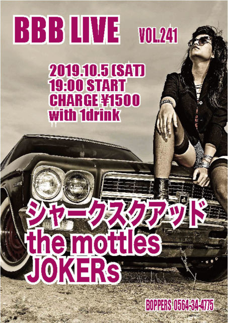 BBB LIVE 241 2019.10.5 (SAT) 19:00 START CHARGE \1500 with 1drink シャークスクアッド the mottles JOKERs