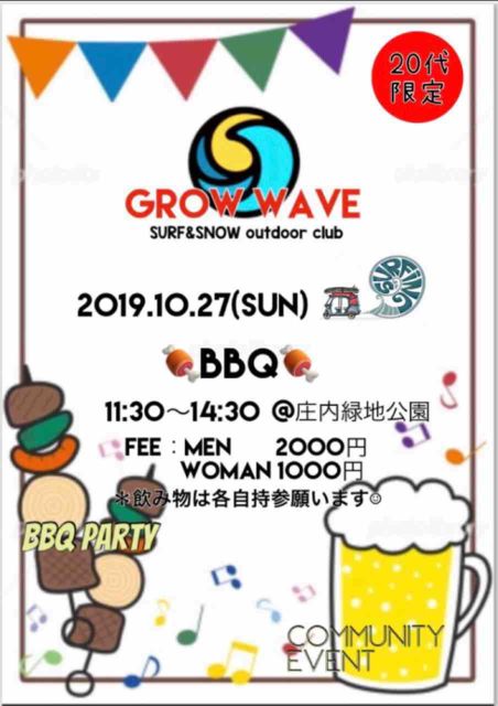 SURF&SNOW OUTDOOR CLUB ☆GROW WAVE☆企画 BBQ&芋煮イベント 肌寒い季節になり雪山のシーズンが近づいてきましたね( ^ω^ ) 海や山のスポーツをはじめアウトドア好きの皆さんこんばんは☺︎ それから はじめましての方や今はやったことはないけれど… スノーボード/スキー、サーフィン、サップ、ボルダリングなどなどこれからやってみたい方々! 同じような境遇の仲間が欲しい方、理由は様々。 皆さんなりに自由に活用及び活動しているコミュニティですので気軽にご参加下さい! ◉参加希望の方ご連絡お待ちして
