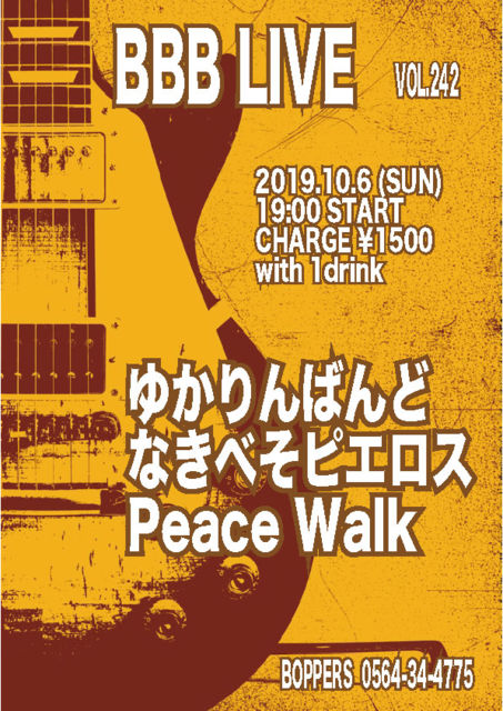 BBB LIVE 242 2019.10.6 (SUN) 19:00 START CHARGE \1500 with 1drink ゆかりんばんど なきべそピエロス Peace Walk