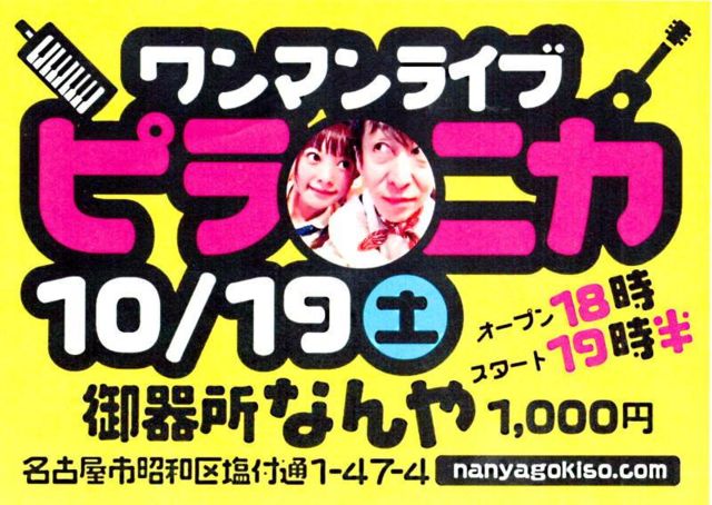 10·î19Æü(ÅÚ) °¦Ãθ© ̾¸Å²° ¸æ´ï½ê ¤Ê¤ó¤ä http://www.nanyagokiso.com/ ¡Ö¥Ô¥é¥Ë¥«¡¦¥ï¥ó¥Þ¥ó¥é¥¤¥Ö¡× ½Ð±é¡§¥Ô¥é¥Ë¥«(¥±¥í¥è¥ó:Vo&¥Ô¥¢¥Ë¥«¡¢¥Ò¥Ç¥Ò¥³:G&Vo) open18:00 start19:30¡¡¥Á¥ã¡¼¥¸1000±ß +1DRINK