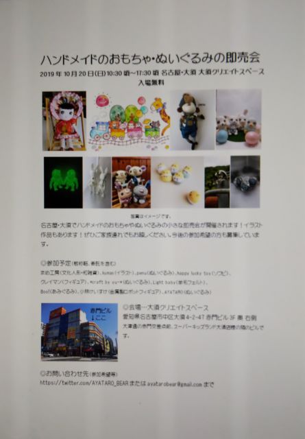 10·î20Æü(Æü)¡¢Ì¾¸Å²°¤ÎÂç¿Ü¤Ç¥Ï¥ó¥É¥á¥¤¥É¤Î¤ª¤â¤Á¤ã¤ä¤Ì¤¤¤°¤ë¤ß¤Î¨Çä²ñ¤¬¹Ô¤ï¤ì¤Þ¤¹¡£¾®¤µ¤¯¤Æ¤âÇ»¤¤¥¤¥Ù¥ó¥È¤Ë¤Ê¤ê¤½¤¦¤Ç¤¹¡£½ÐÉʺîÉʤϿô¤Ë¸Â¤ê¤¬¤¢¤ê¤Þ¤¹¤Î¤Ç¤ªÁá¤á¤Ë¤É¤¦¤¾¡ª²ñ¾ì¤ÏÂç¿Ü¥¯¥ê¥¨¥¤¥È¥¹¥Ú¡¼¥¹¤Ç¤¹¡£