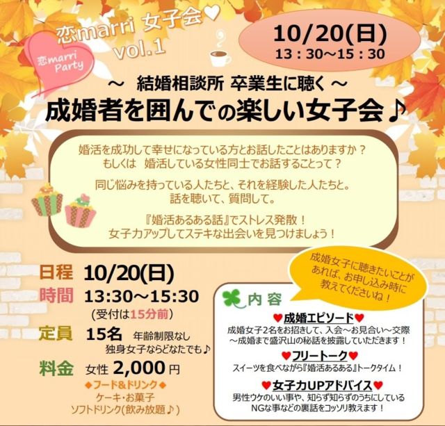 管理人さま、貴重なスペースをお借りしますm(__)m エルリアンでは 『スタッフ全員がプロのマリッジカウンセラー』 という、あなたの婚活をサポートする「恋marri」を立ち上げました 安心してあなたのベストパートナーを見つけましょう 今回のイベントは、婚活女子から要望がとっても多かった『女子会』を開催します スペシャルゲストとして、結婚相談所で出会い幸せな結婚生活を送っている女性2名 婚活を成功して幸せになっている方とお話したことはありますか? もしくは婚活している