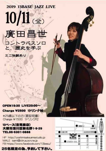 久しぶりに廣田昌世コントラバスソロ ショーを させていただくことに なりました。 即興、オリジナル、ジャズスタンダードをどうお料理しようかなぁと今からワクワクしております。 今回はコントラバスの歴史のお話(ふくらみますよー) コントラバスに触れてみようー体験コーナーも設けたりいたします。 音楽大スキー ベース大スキー、コントラバス大好きー、 そんなみなさま、どうぞお気軽にいらしてくださいね。 楽しくコントラバスの音を、そして一緒に学びましょう open 19:30 start 20:00 〜2stage(各45分予定) チャージ2500円 1ドリンク付き