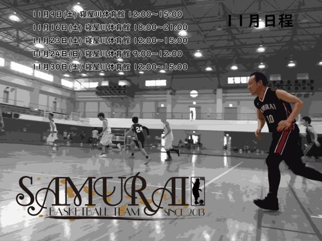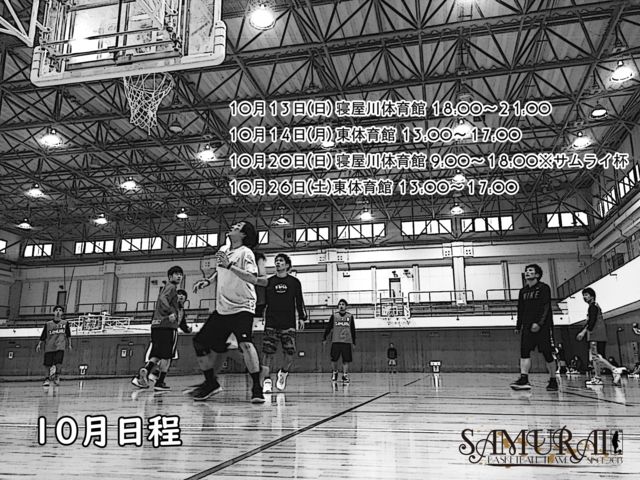2019年10月13日(日)寝屋川市民体育館 18:00〜21:00 2019年10月14日(月)東体育館 13:00〜17:00 遅刻や早退連絡してください 参加する場合は、名前性別人数を書き込みおねがいします。 軽くアップしゲームします。 募集要項 参加費500円 18歳以上高校生、初心者不可 男女バスケ経験者 レベル 初級〜中級 諸注意、参加される方は確認お願いします ⇩⇩⇩⇩ http://samuraibbt.wixsite.com/samurai SAMURAI Facebook https://www.facebook.com/samuraiBBT/ https://www.facebook.com