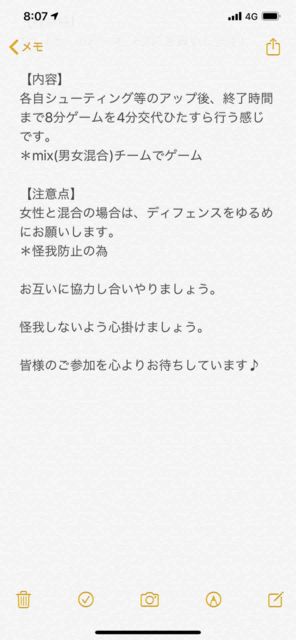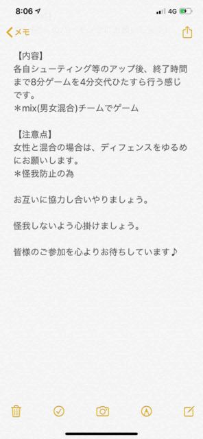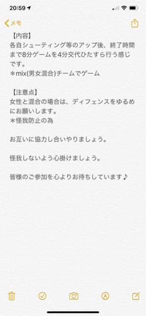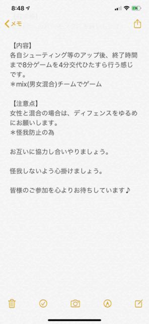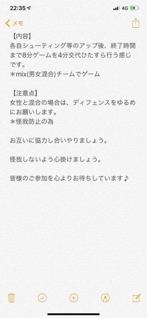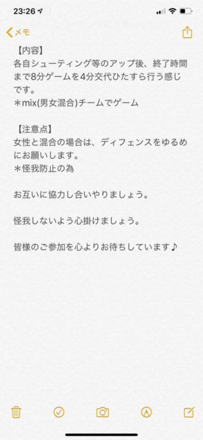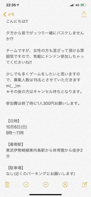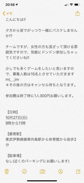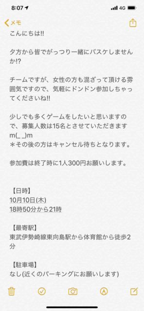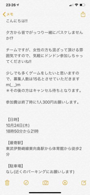 男女問わず。 経験者多目。 チーム分けの為のリバか、白とそれ以外の色Tお忘れなく! コメントかメッセージください! 詳細送ります! 【日時】 ・ 10/24(木) ・18:30体育館オープン。 集まり次第開始。21:00完全退出 【定員】 MAX18人くらい 【持ち物】 ・ボール ・チーム分けのための濃淡シャツまたはリバーシブル ・飲み物 【参加費】 ¥300 【注意事項】 ・バイク・車はNG