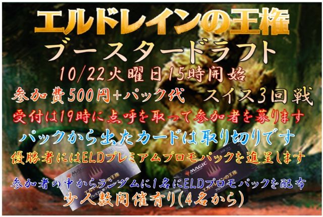 DCI公認 プレミアムプロモパック争奪『エルドレインの王権』ドラフト のご案内です。 受付は 当日 15:00 となっておりますので参加希望の場合は上記の時間に遅れないようにご来店ください。 参加費は500円です。(※別途パック代) 参加定員は8名毎となります。 ※最大2卓16名まで、4名から少数開催あり。 形式は『エルドレインの王権』ブースタードラフトとなります。(『エルドレインの王権』×3パックを使用したドラフトを行い40枚以上のデッキを構築。デッキ構築時間は15分です。※一人回しやスリーブ挿入時間含む) ドラフトしたカ