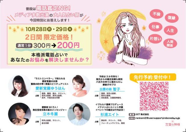 ※先着予約順※残り29枠 普段は電話占いを滅多に行わない、有名占い師陣が2日間限定で特別に電話鑑定を行います! 今回特別価格として【1分200円】で当たる占いをお試し頂けます。 占い好きの皆さま、是非この機会にあなたのお悩みを相談してみてください ▼ご予約・詳細はこちら http://renkami.indexweb.co.jp/page/tellkikaku2/?utm_source=mixi&utm_medium=com&utm_campaign=20th_tellkikaku ▼参加占い師 ・愛新覚羅ゆうはん ・出雲の姉智子 ・立木冬麗 ・杉浦エイト(Code)
