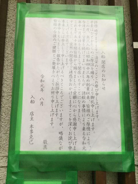 奥沢駅近くの鮪で有名な入船寿司が、ついに閉店することとなってしまいました 昭和43年創業で、約50年。 11月の末日にて閉店だそうです。 で、まぐろづくしコースと迷ったのですが、 折角なので、お料理やお刺身の付いた、おもてなし膳26,460円にしたいと思います。 https://www.hotpepper.jp/strJ000247762/course_cnod02/?vos=alhpppaltrzzx00000004 いいお値段なので、ヤラセ的ですが、事前募集にて予約人数の4名決めてしまいました。 増員は可能かもしれないので、下記の3名以外の方は、参加ポチは押さず、とりあえずキャンセ