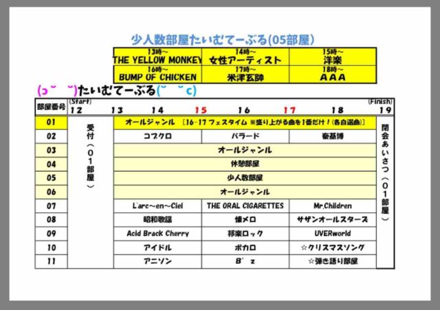 10月26日土曜日に第百二十四回新潟アニカラ大同盟持込カラオケオフ会を開催します 都合のよろしい方は奮ってご参加ください 【開 催 日】2019年10月26日 (土曜日) 【開催時間】23時〜翌朝6時 【開催場所】カラオケマイム 新潟笹口店 http://karaokemaimu.com/niigata/karaokemaimu-sasaguti.html 【料 金】1600円(割引チケット使用、税込み、ドリンクバー付) 【締め切り9月25日(金)22時まで ・人数が3人に満たない場合は中止または順延する場合があります。 ・幹事の連絡先等が知りたい方はメッセージにてお問い合わせ下さい 折り返