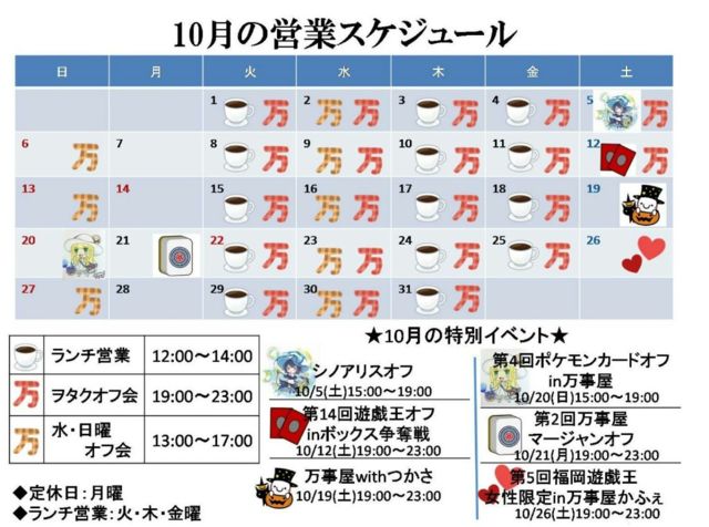 ★★万事屋オフ会スケジュール【10月】★★ ★10月のイベント★ ◆『シノアリスオフ』 10/5(土)15:00 〜 19:00 ◆『第14回遊戯王オフinボックス争奪戦』 10/12(土)19:00〜23:00 ◆『万事屋withつかさ』 10/19(土)19:00〜23:00 ◆『第4回ポケモンカードオフ』 10/20(日)15:00〜19:00 ◆『第2回万事屋マージャンオフ』 10/21(月)19:00〜23:00 ◆『第5回福岡遊戯王女性限定in万事屋かふぇ』 10/26(土)19:00〜23:00 ◆コンテンツ ◆ ・モンスト ・モンハンX ・コスプレ ・YouTube、ニコ動観賞 ・ボカロPV鑑賞&談義 ・遊戯王カード ・