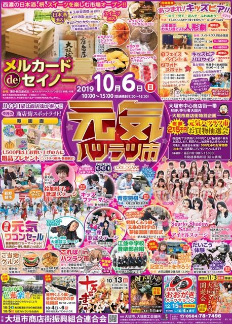 岐阜県大垣市の大垣駅前商店街で開催の元気ハツラツ市! 市政101年目も元気に大垣市を盛り上げてます 毎月変わる商店街のイベント企画、出店店舗もずらり 映画「聲の形」のロケ地でも有名です ☆ イベント情報 開催日時:2019年10月06日(日)10:00 〜 15:00 会場名称:大垣駅前商店街・大垣城一帯 開催名称:元気ハツラツ市 〜 これぱ!in ハツラツ市33 〜 ☆ イベント詳細 本部受付:安藤証券 大垣支店前 受付時間:メンバー / 09:15 〜 ※メンバーズカード提示 一般 / 10:00 〜 更衣室 :女性 / 高屋稲