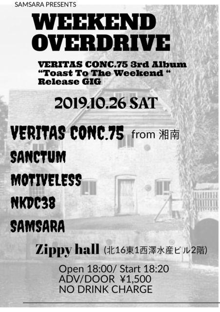SAMSARA PRESENTS WEEKEND OVERDRIVE VERITAS CONC.75 3rd Album"Toast To The Weekend"Release GIG 2019.10.26 SAT VERITAS CONC.75 from¾ÅÆî SANCTUM MOTIVELESS NKDC38 SAMSARA Zippy hall ¡ÊËÌ16¾òÅì1ÃúÌÜÀ¾ß·¿å»º¥Ó¥ë£²³¬¡Ë Open 18:00/ Start 18:20 ADV/DOOR \1,500 NO DRINKCHARGE