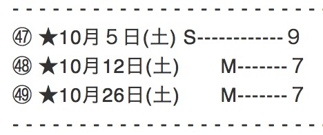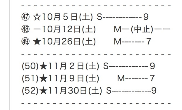 ●月日/10月26日(土) ●時間/18:30〜21:00(20:30から片付け・清掃) ●会場/水戸の施設 (M) 初参加者には前夜までに地図を送信 カーナビでは誤誘導され到着できません ●定員/7名 →9名(1台をダブルスで) ●最小催行人数/5名 ●現在の参加者数/9名 mixi外参加 4名 ミヤタさん、ネコミックさん、けいこさん、いどさん ーーーーーーーーーーーーーーーーーーーーーーーーー 夜間の屋外での「会話」や物音は 近隣住人への迷惑になります。 極力お控えくだ