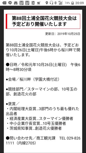今年も土浦の花火(土浦全国花火競技大会)の鑑賞会を行います。 日本3大花火大会(長岡、大曲、土浦)のトリとなる花火大会を桟敷席(有料観覧席)で一緒に見ませんか?夏の花火とはひと味違う秋の花火大会を楽しみましょう! (土浦の花火概要) <日時> 2019年10月26日(土)17:45〜20:30頃(荒天延期) <内容> 競技花火(スターマインの部、10号玉の部、創造花火の部)、大会提供花火(土浦花火づくし)、エンディング花火、スポンサー花火、レクチャー花火、花火師登場 <打ち上げ発数> 約2万発 <その他> 土浦の花火の見どころ等(2018年募