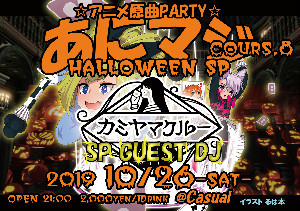 10/26-sat- あにマジ cours.8 HALLOWEEN SPECIAL OPEN 21:00 2.000yen/1Drink -discount- withFRYER 500yen off 自衛隊 500yen off(要ID) コスプレ来場 500yen off Twipla参加表明 500yen off ※各ディスカウントは重複不可 枚数限定MIX CD無料配布有り -アニメ原曲PARTY- -SP GUEST DJ- カミヤマクルー -DJ- SETO Hi米 OYSTER GAISON しもふり のすけ アントキノ博 HIZMA -VJ- さいきょん くるる 麦わらの大谷 -あにマジGirl- AYANE LEV