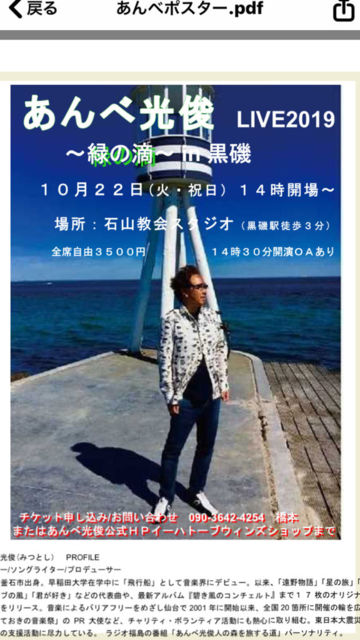 日時 10月22日(火祝)14開場半 16時終演予定 会場 石山教会スタジオ (栃木県黒磯駅西口) 全席自由 3500円 ※オープニングアクト 鮭オーケストラas桂木ヤコブソンwith派遣藤波 ※須田しおり「365日」ピアノ伴奏 主催、あんべさんを那須で聴く会 橋本さん チケット予約090−2480−7905(佐藤) oumatokaeru@docomo.ne.jp (橋本)