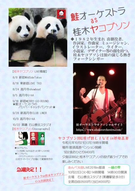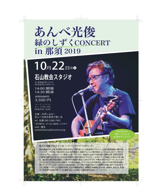 あんべ光俊LIVE2019 in 那須 2019 10月22日 (火 祝) 会場 石山教会スタジオ(割烹石山 黒磯駅徒歩3分) 14時開場 14時30分海運 全席自由3500円 (当日4000円) 秋の深まる那須高原で 最新アルバム「蒼き風のコンチェルト」も大好評の フォークシンガー「あんべ光俊さん」 のオープニングアクトを 鮭オーケストラas桂木ヤコブソンが務めさせていただくことが決定しました。 それに先がけ 前21日(月) 那須高原ペンションおかざき にて 桂木ヤコブソンBBQライブを開催し
