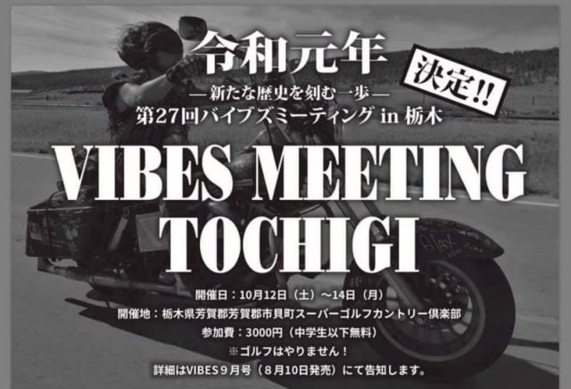 道楽集会〜愛すべき残党の宴〜 VIBES MEETING 栃木で茣蓙を広げさせてもらい開催します ★time&day→2019年10月12日(土)〜14日(月) ★place→スーパーゴルフカントリー倶楽部(栃木県芳賀郡芳賀町市貝) ★entryfee→3000円 参加パッチ付き (これはVIBES MEETING参加費です) ◎刺繍屋アディクションズさんから協賛いただき参加賞に「道楽ミーティング」参加パッチ進呈 ◎記念Tシャツを受注限定で販売します ◇Mr.Bike BG誌のライターさんから告知と取材?あり 詳細は随時していきます