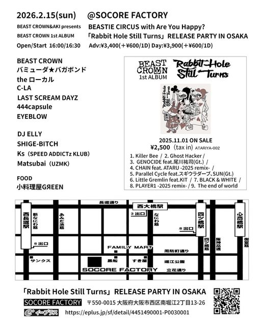BEAST CROWN&AKI presents BEASTIE CIRCUS with Are You Happy? BEAST CROWN 1st ALBUM 「Rabbit Hole Still Turns」RELEASE PARTY IN OSAKA 2026.2/15(sun)@SOCORE FACTORY Open/Start 16:00/16:30 Adv:\3,400(+\600/1D) Day:\3,900(+\600/1D) BEAST CROWN バミューダ★バガボンド the ローカル C-LA LAST SCREAM DAYZ 444capsule EYEBLOW DJ ELLY SHIGE-BITCH Ks(SPEED ADDICTz KLUB) Matsubai(UZMK) FOOD 小料理屋GЯEEN チケットチケット 12/17(水) イープラスより発売開始 https://eplus.jp/sf/detail/4