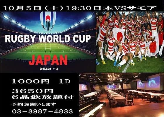 10/5 日本VSサモイ ラグビーワールドシリーズ 場所探ししてる方は是非ご来店ください! 圧倒の7スクリーン 迫力の音響システム 臨場感抜群です! 1000円 1D 3650円 料理6品+飲み放題 コースは予約お願いします! 豊島区東池袋1−35−3センタービルb1 dopelounge 03-3987-4833