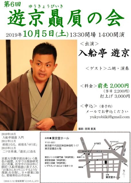 遊京贔屓の会のフラッグシップイベント「第6回 遊京贔屓の会」 日時:10月5日(土)14:00開演(13:30開場) 場所:東京堂ホール(神田神保町) 出演:入船亭遊京 木戸銭:2000円+打ち上げ3000円 主催:遊京贔屓の会 yukyobiiki@gmail.com