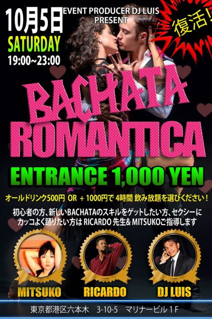 10月5日(土)BACHATA ROMANTICA NEW PLANET #BachataRomantica New Planet 10月5日土曜日 19:00〜 23:00 「NEW PLANET」 港区六本木3-10-5 マリーナビル1F最寄駅 六本木5番出口 エントランス 1000円 DJ DJ LUIS (LATINOCHANELL) DANCER RICARDO (ドミニカ) << CD サイン付き 販売 特価 >> MANNY ROD ヒットソング LIMITED EDITION CD 2000円 VIVELATINO JAPAN 公式CD 2000円 2枚ご購入の場合は 特価 3000円 *RUGBY 日本VSサモア大画面DE楽しめます!