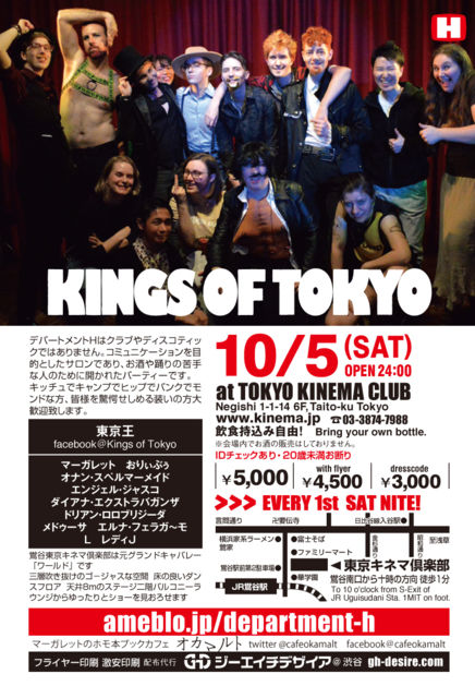10月5日第1土曜日デパートメントH 2099 open 24:00 @鶯谷東京キネマ倶楽部http://www.kinema.jp 03−3874−7988 ¥5000/ ¥4500フライヤー持参/ ¥3000ドレスコード 飲食持込自由。会場内でアルコール類の販売はしておりません。 男女更衣室有り。 写真付IDチェック有り。 予告編https://togetter.com/li/1401460 前回のあらましhttps://togetter.com/li/1383664 香盤表 0000 open 0120 OP:DQ紹介 0140 東京王https://www.facebook.com/kingsoftokyojp 0200 レイチェル・ダムールhttps://twitte