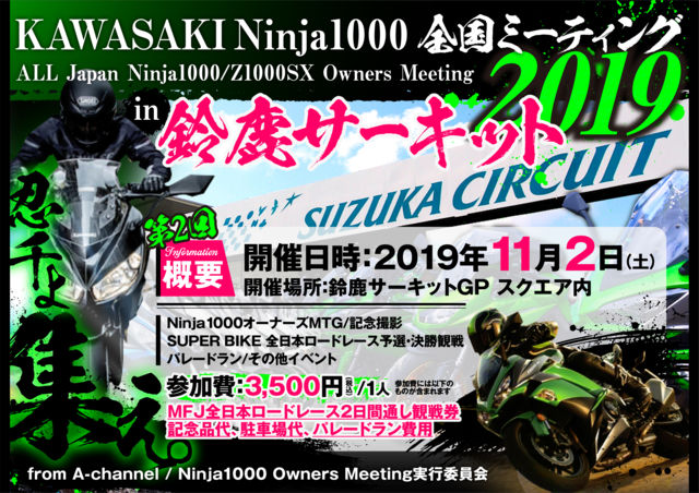 【御礼】 2019 Ninja1000オーナーズミーティング、無事終える事が出来ました。 各方面より多大なご協力、沢山のご参加、誠にありがとうございました^^ 同じNinja1000に乗るライダー同士、少しでも交流の場になりましたら幸いです。 皆さんと一緒に、ワンメイクでパレードラン出来た事を非情に嬉しく思います。 これを機に各地でNinja1000の交流が広がれば更に嬉しく思います。 本当にありがとうございました^^ 【更新情報】 ・シュアラスター様の協賛が決定しました★ 【更新情報】 協賛決定 ★ACRY−Point様★BEET JAPAN様