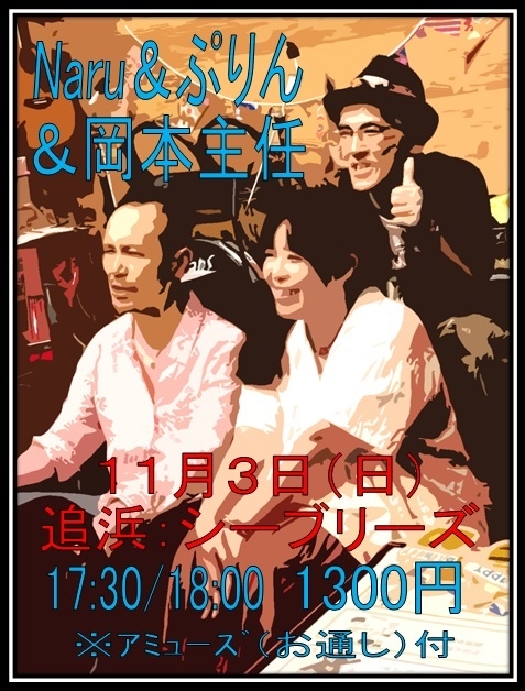 ●概要 11月3日(日) 追浜:シーブリーズ http://sea-breeze.crayonsite.net/ 岡本主任とNaru&ぷりん 17:30/18:00 1300円(アミューズ付)+2オーダー ●タイムスケジュール 18:05 岡本主任 18:20 Naru&ぷりん 19:05 休憩 19:15 岡本主任 19:50 アンコールセッション 20:00 終演〜打ち上げ!