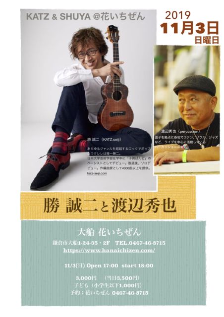 湘南ウクレレサークルの皆様へお知らせです。 11/3(日)大船の花いちぜんという 沖縄居酒屋でライブやります! 9月に予定していたライブが台風で飛んで この日に延期になったという リベンジライブです。 パーカッションの渡辺秀也さんとのデュオで お届けいたします。 台風で飛んだ分、熱く盛り上げますので よろしくね〜。 -------- 11/3(日)大船 花いちぜん https://www.hanaichizen.com/ open 17:00 start 18:00 料金3,000円(当日3,500円)※小学生以下1,000円 予約:花いちぜん 0467-46-8715